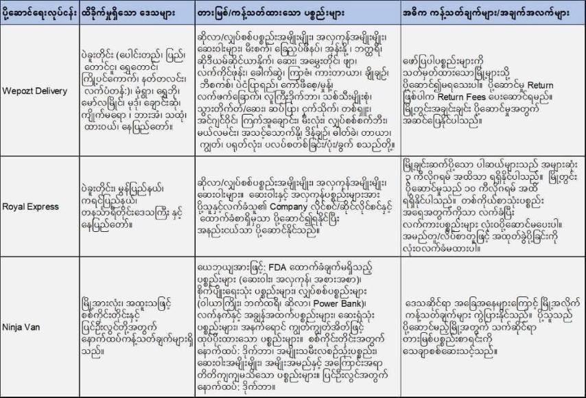 လက်ရှိမှာ အိမ်အရောက်ပို့ Delivery လုပ်ငန်းတွေအနေနဲ့ ရန်ကုန် နဲ့ မန္တလေးတိုင်းနှစ်ခုသာ ပစ္စည်းပို့မှု အဆင်ပြေတဲ့အခြေအနေအရှိကြောင်း ကျန်တဲ့ဒေသတွေကို ပစ္စည်းပို့မှု ပိုပြီးခက်ခဲလာနေတယ်လို့သိရပါတယ်။