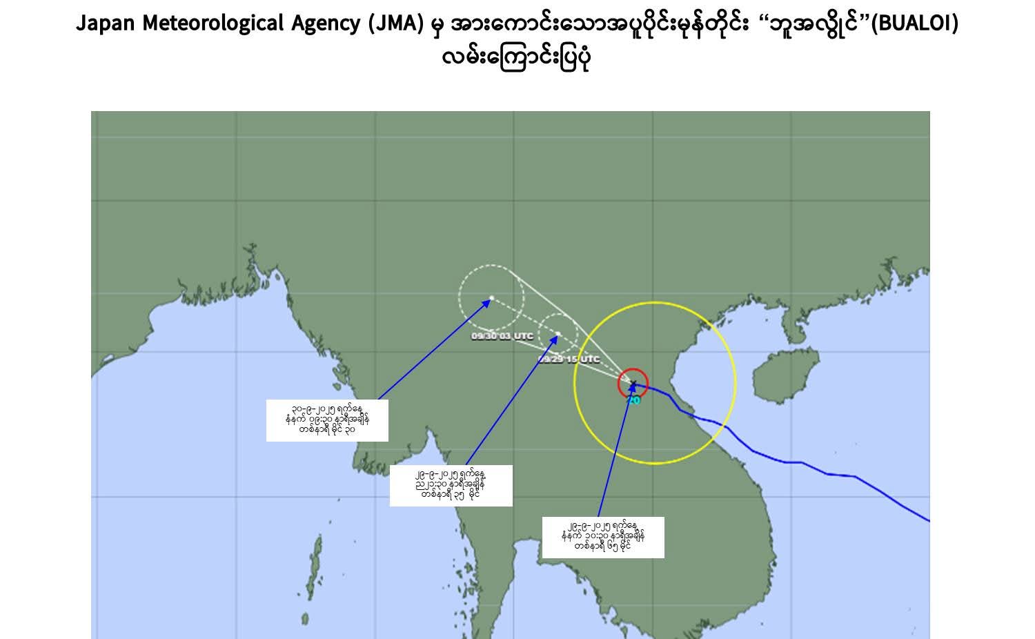 အားကောင်းတဲ့ အပူပိုင်းမုန်တိုင်း “ဘူအလွိုင်” ဟာ မနေ့ စက်တင်ဘာ ၂၈ ရက်၊ ညပိုင်းမှာ ဗီယက်နမ်နိုင်ငံကို ဖြတ်ကျော်ခဲ့ပြီးဖြစ်ကာ ဒီကနေ့ စက်တင်ဘာ ၂၉ ရက်၊ နေ့လယ်ပိုင်း အချိန်မှာတော့ လာအိုနိုင်ငံကို ရောက်ရှိနေပြီဖြစ်ကာ အပူပိုင်းမုန်တိုင်းအဆင့်နဲ့ အားလျော့လာတဲ့ အနေအထားမျိုးရှိတယ်လို့ ဒေါက်တာကျော်မိုးဦးက ပြောပါတယ်။