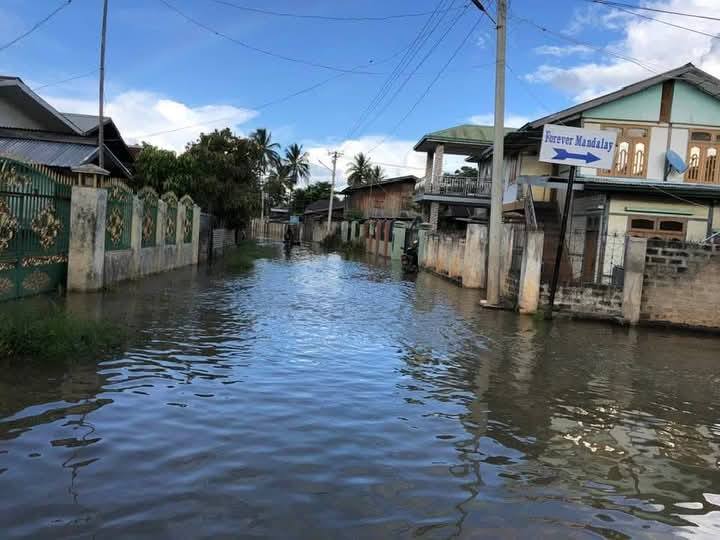 “အခု ရေစိမ့်ဝင်နေတဲ့ နေရာတွေက အနိမ့်ပိုင်းတွေလည်း ဖြစ်သလို ချောင်းဘေးက ရပ်ကွက်တွေလည်းဖြစ်တယ်။ ချောင်းဘေး တောက်လျှောက်ကို ရေကြီးနေတာ။ စပါးခင်းတွေလည်း တော်တော်များများ နစ်ကုန်ပြီ။ ရိတ်သိမ်းရတော့မယ့် စပါးတွေပါ။ ဒီနှစ်ကတော့ ဘယ်လိုမှ ပြန်စိုက်လို့ မရနိုင်တော့ဘူး။ ဒီတိုင်း ထိုင်ကြည့်နေရုံပေါ့။ နှစ်ထပ်ဈေးဘက်မှာလည်း ရေဝင်နေတယ်။ မိုးကလည်း ဒီနေ့အထိကို သည်းသည်းမည်းမည်း ရွာနေတော့ ရေက ခုချိန်ထိ ဆက်တိုးနေတုန်းပဲ” လို့ ဒေသခံတယောက်က ပြောပါတယ်။
