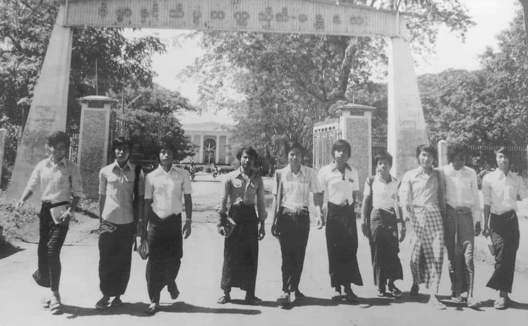 ကျောင်းသူ သုံးယောက်ပဲ။ သည်အထဲက မျက်ခုံးမွှေးတွေဆွဲ၊ နှုတ်ခမ်းနီတွေ ရဲနေအောင်ဆိုးကာ ခပ်မြင့်မြင့် ဒေါက်ဖိနပ် နှင့် အမွေးပွတွေ ဖားလျားနှင့် လွယ်အိတ်ကို လွယ်ထားသော ကျောင်းသူက ဆို၏။
