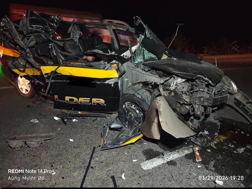 မတ် ၃၀ ၊ ၂၀၂၆ GG (VOM) ပဲခူးတိုင်း ၊ ဝေါမြို့နယ် ၊ ရန်ကုန် – မော်လမြိုင် ကားလမ်းပေါ်မှာရှိတဲ့ ညောင်ခါးရှည်အနီးမှာ မတ် ၂၉ ရက်နေ့ ည ၇ နာရီခွဲလောက်က ယာဥ်တိုက်မှုဖြစ်ပြီး သုံးယောက်သေဆုံးမှု ဖြစ်ပွားခဲ့တယ်လို့ သိရပါတယ်။ ဖြစ်စဥ်မှာ ညောင်ခါးရှည်အနီးရပ်ထားတဲ့ ၁၂ ဘီးကားကို Taxi အငှားယာဥ်က နောက်ကနေ အရှိန်ပြင်းပြင်းနဲ့ ဝင်တိုက်မိပြီး ကားပေါ်ပါသူ သုံးယောက်လုံး နေရာမှာပဲ သေဆုံးခဲ့ရတာဖြစ်ကြောင်း ၊ သေဆုံးသူတွေက သားအဖနှစ်ယောက်နဲ့ အမျိုးသမီးတယောက်တို့ ဖြစ်တယ်လို့ သိရပါတယ် ။ ” ၁၂ ဘီးကားက ထင်းတွေသယ်လာတာ။ အဲဒီကားကို လားရာတူ taxi က နောက်ကနေ ဝင်တိုက်တာ ။ သေတာ taxi ပေါ်ကပါ။ ။ယာဥ်မောင်းအမျိုးသားနဲ့…